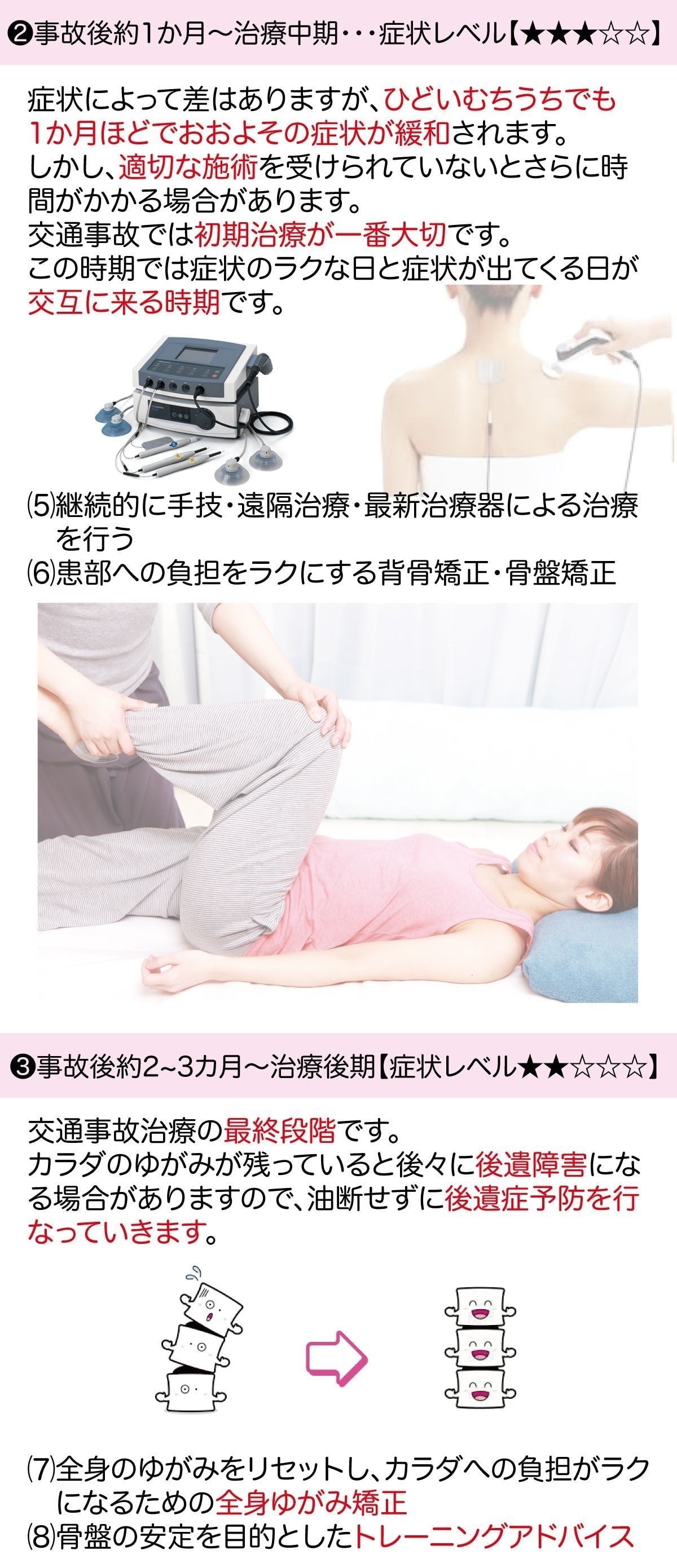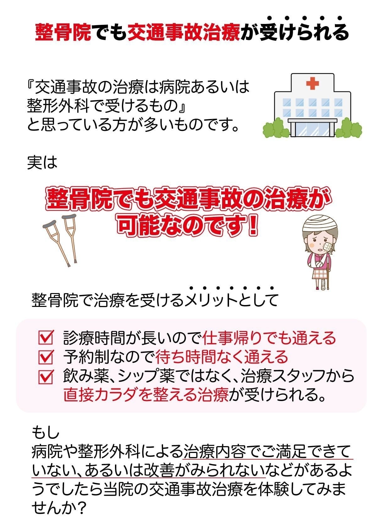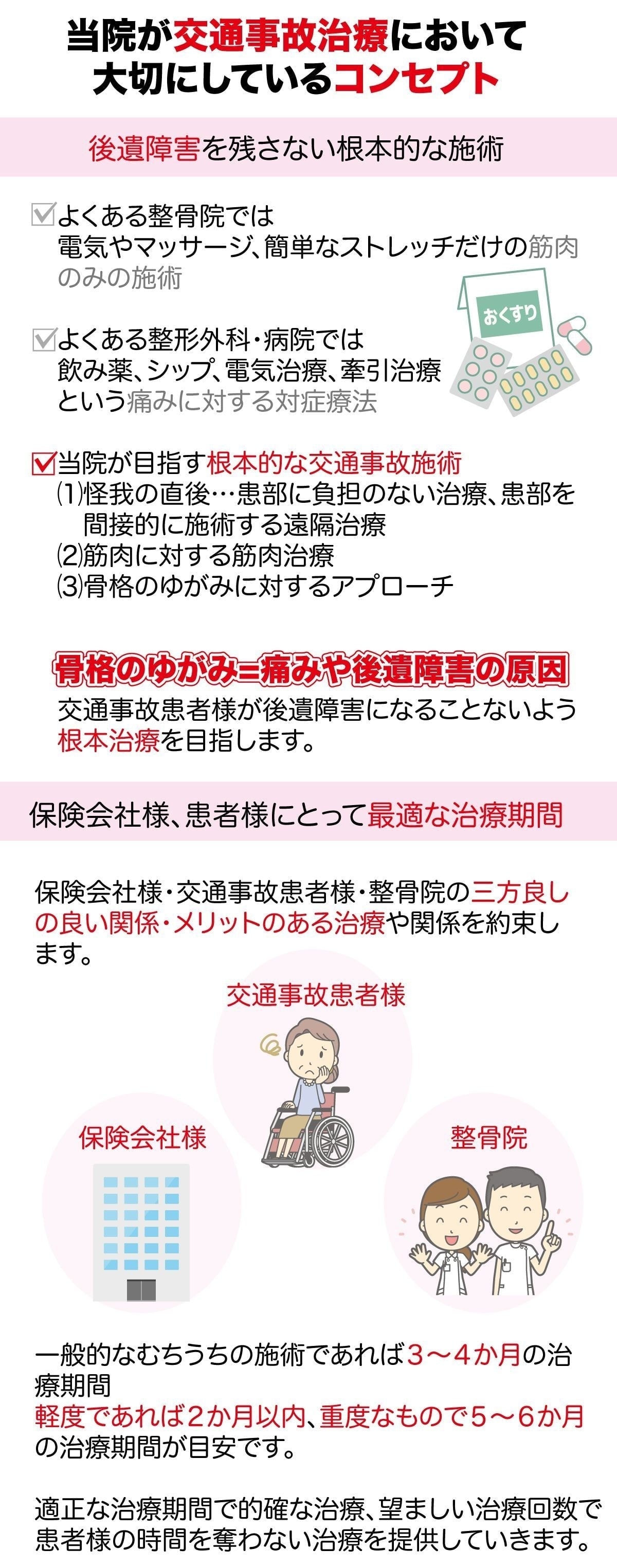 単に整形外科のような医療施設では対応してもらうことができないだけであり、わたなべ鍼灸整骨院では根本的な交通事故治療ができる整骨院です。